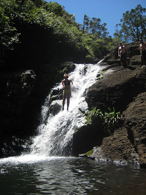 + finally lou...actually, that's more the jump you do when you're a kid. A bit further up Ben and pete went in under the falls, I was too scared of the possibility of eels, I think pete wasn't scared of eels cause he didn't believe there really were any, he's really cautious of my warnings after I pretended the waves in the sand in Gisbourne were made by snakes that come up out of the ocean to slumber under the sand on the beach.